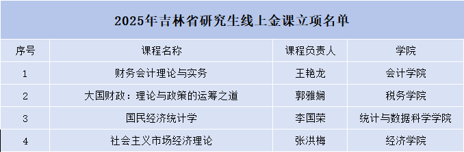 近日,吉林省教育厅公布了首批研究生线上金课认定名单,我校共有4门课程成功入选,涵盖理论经济学、应用经济学、统计学、工商管理学等优势学科领域。